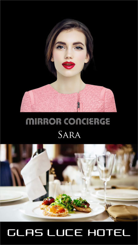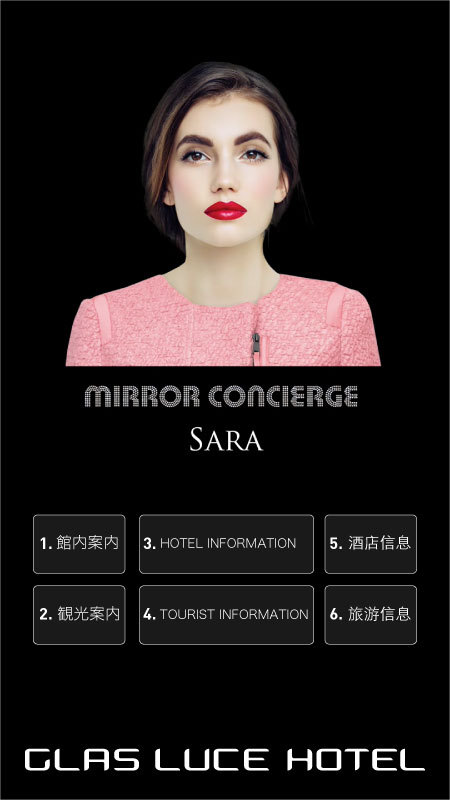 普段は鏡、もしくは環境映像&広告映像。人が近づくと鏡の後ろに隠されたカメラが顔を感知し、鏡の中から等身大のミラーコンシェルジュが現れあなたに話しかけます。ミラーコンシェルジュがPRしたい概要を映像と写真で説明し、詳細を選べるボタンが表示されます。ボタンを押すとミラーコンシェルジュが詳細を説明し、説明が終わると鏡の中に消えていきます。(GLAS LUCEの商品を使用)