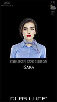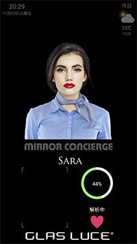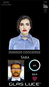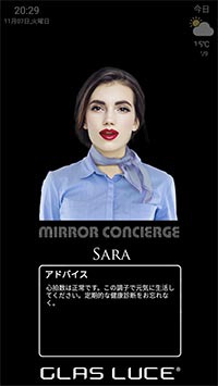 鏡の裏面に設置してあるカメラが顔の血流を測定して心拍数と脈波とリラックス度を表示します。その日の心拍数と今までクラウドに蓄積されたデータと照らし合わせ体の状態のアドバイスを行います。ご家庭では家族の顔を初期登録しその個人の心拍数データを蓄積解析します。病気になる前の状態「未病」の段階で異常を察知し対処することにより医療の世話にならないための健康維持・増進・健康管理をヘルスケアコンシェルジュとともに行います。