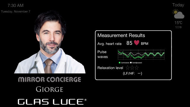 Our new technology allows the camera in the mirror to measure the blood flow of the face and display the person’s heart rate, blood circulation rate (a form of bold pressure reading) and stress level. It will compare the heart rate of that day and the status of the individual’s health against data accumulated in the cloud on that person to date. At home you register your family's faces the first time you use it and then the health data is accumulated and analyzed each day after.