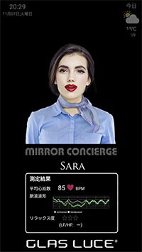 鏡の裏面に設置してあるカメラが顔の血流を測定して心拍数と脈波とリラックス度を表示します。その日の心拍数と今までクラウドに蓄積されたデータと照らし合わせ体の状態のアドバイスを行います。ご家庭では家族の顔を初期登録しその個人の心拍数データを蓄積解析します。病気になる前の状態「未病」の段階で異常を察知し対処することにより医療の世話にならないための健康維持・増進・健康管理をヘルスケアコンシェルジュとともに行います。